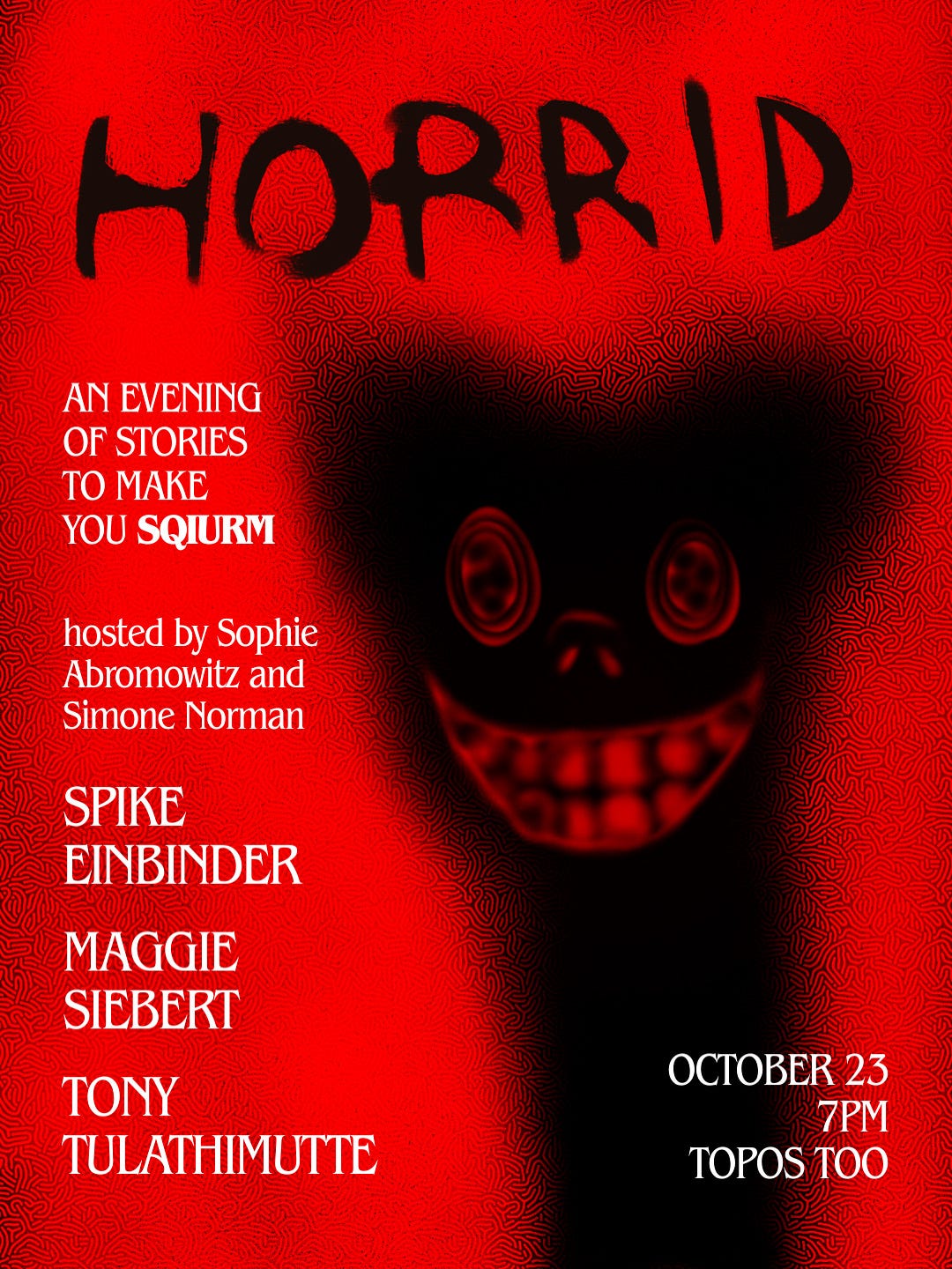 horrid is a bi-monthly horror fiction reading series i co-host with writer/actor/comedian/known beauty simone norman at topos too, in historic ridgewood brooklyn. past guests include jamie hood (trauma plot), zefyr lisowski (uncanny valley girls), melissa lozada-oliva (beyond all reasonable doubt, jesus is alive!), and gerardo sámano córdova (monstrilio).
